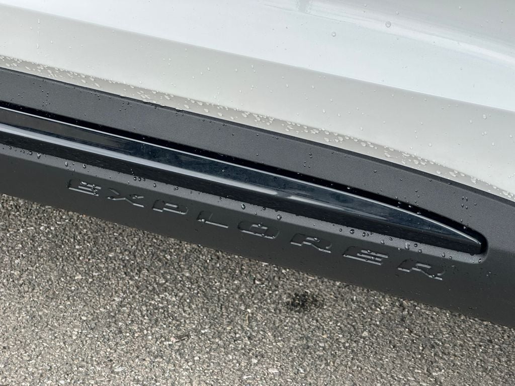 The exterior of the 2026 Ford Explorer ST commands attention with its bold, muscular styling and the stunning White Metallic Tri-Coat paint. The 21-inch Magnetite-Painted Aluminum wheels and sleek spoiler further accentuate the vehicle's sporty and sophisticated appearance.