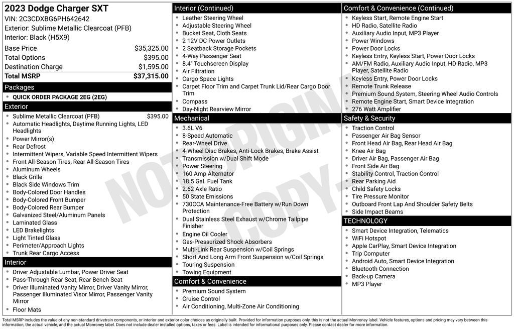 Under the hood, the powerful 3.6L V6 24V VVT engine, paired with an 8-Speed Automatic transmission and Rear-Wheel Drive, delivers an exhilarating driving experience. With an impressive 19 city/30 highway MPG, this Charger SXT offers exceptional fuel efficiency, making it an ideal choice for both city commutes and open-road adventures.